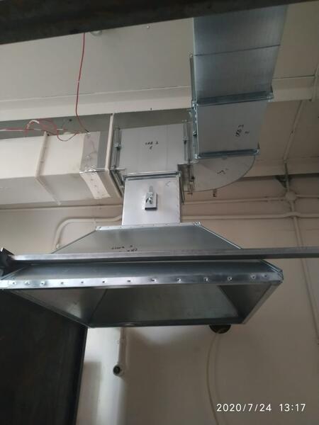 Третий способ – монтаж вытяжных зонтов на тросах или цепях, через кронштейны и анкера к потолку. В верхней горизонтальной плоскости привариваются четыре специальных кронштейна крепления, в которые через карабин фиксируется трос или цепь, другой конец цепи закрепляется к потолку. Высота потолков не так важна. Основная проблема при монтаже таким способом связана с шаткостью конструкции. Довольно сложно обвязать воздуховодами жестко незафиксированную конструкцию.